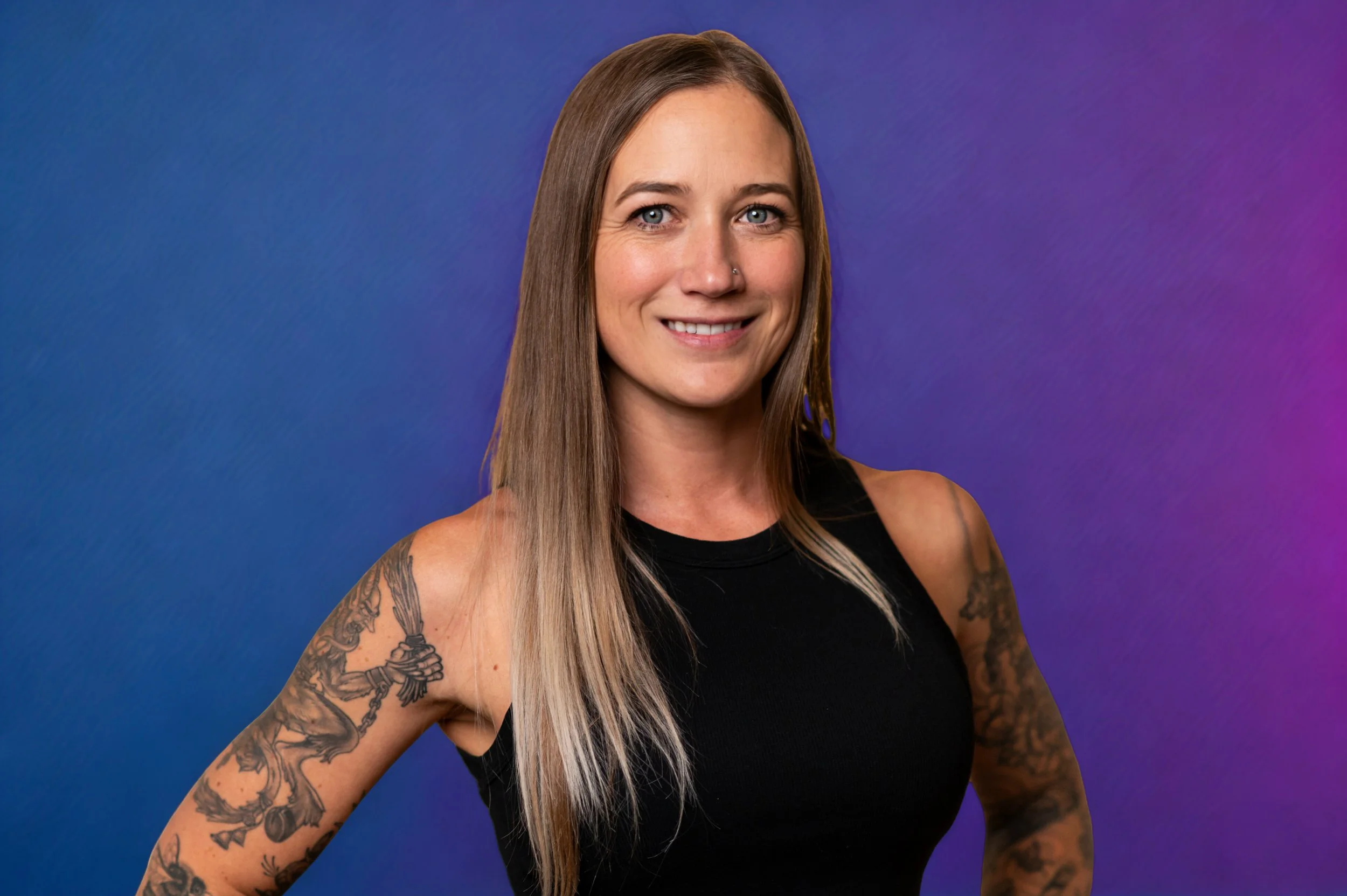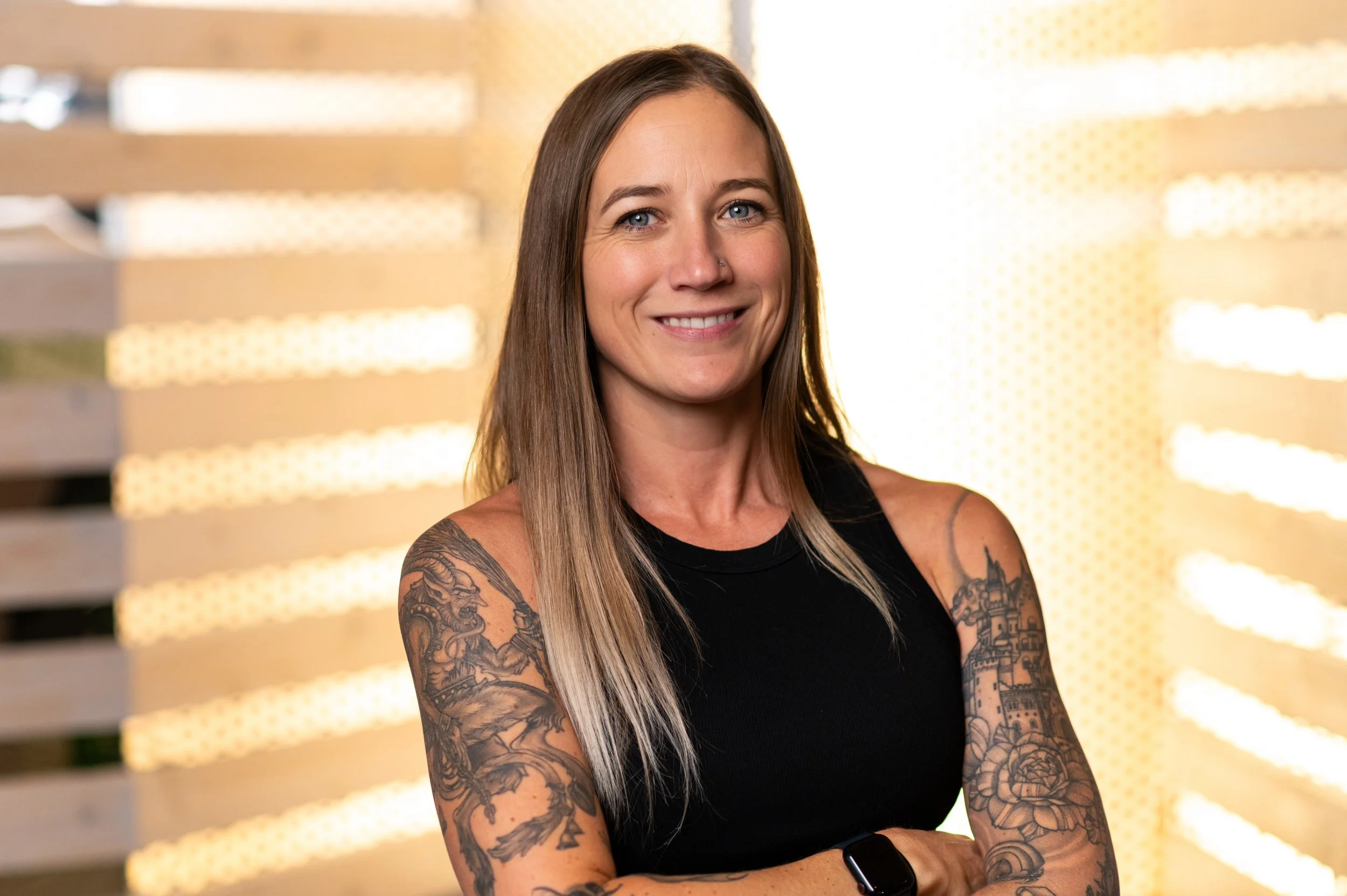 A woman with long blonde hair and tattoos on her arms using a laptop in a dark, modern fitness facility.